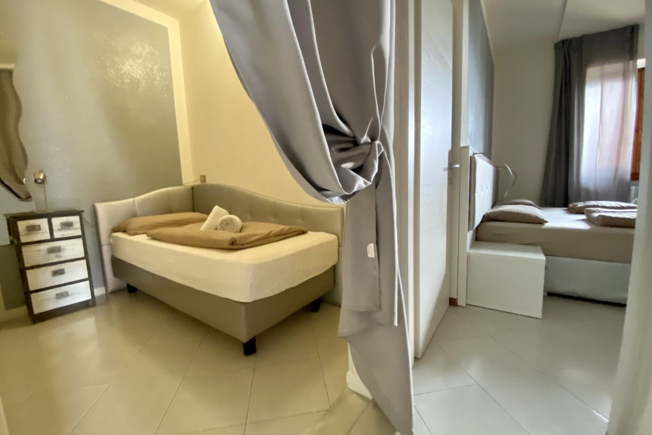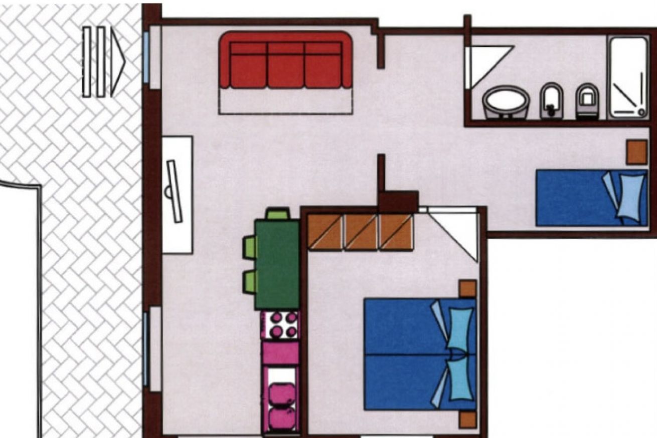 bilocale al piano rialzato, soggiorno con angolo cottura attrezzato e divano letto matrimoniale, una camera da letto matrimoniale, anticamera con letto singolo, bagno con doccia e bidet, tv sat, cassaforte, phon, macchina del caffè a capsule bialetti, bollitore, melitta, parcheggio coperto, biancheria da letto e da bagno